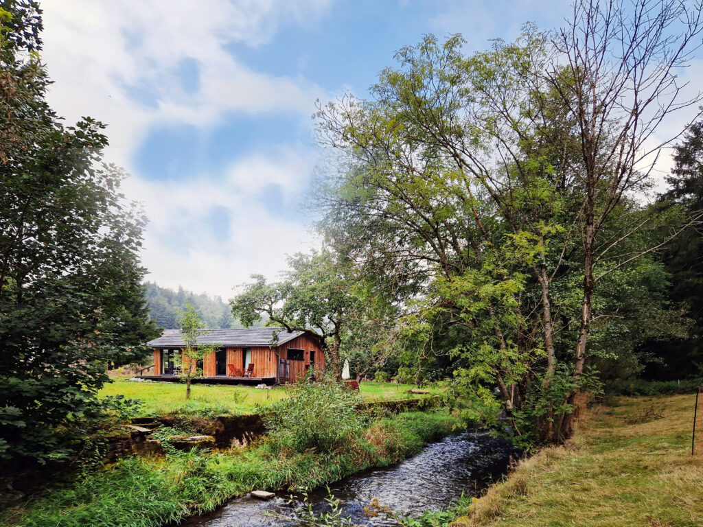 Die voll ausgestattete Küchenzeile im Wohnzimmer ist mit Induktionskochfeld, Geschirrspüler und Kühlschrank mit Gefrierfach und alles was sie für die Selbstverpflegung benötigen ausgestattet. Im angrenzenden Schlafzimmer ist ein großes Doppelbett (2,00 x 1,80 m). Das Bad hat eine begehbare Dusche, ein Waschbecken, WC, Handtuchheizkörper, Schieferfußboden mit Fußbodenheizung. Die ca. 15 m² große Terrasse veräuft entlang der gesamten Südfront des Hauses. Über die Terrasse kommen sie in das Haus und können an warem Sommertagen den Blick in den das Haus umgebenden Garten schweifen lassen. Über die bodentiefen Fenster und die zweiflügelige Balkontür genießen sie auch an kalten und regnerischen Tagen den Blick ins Grüne.